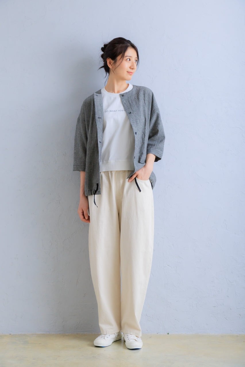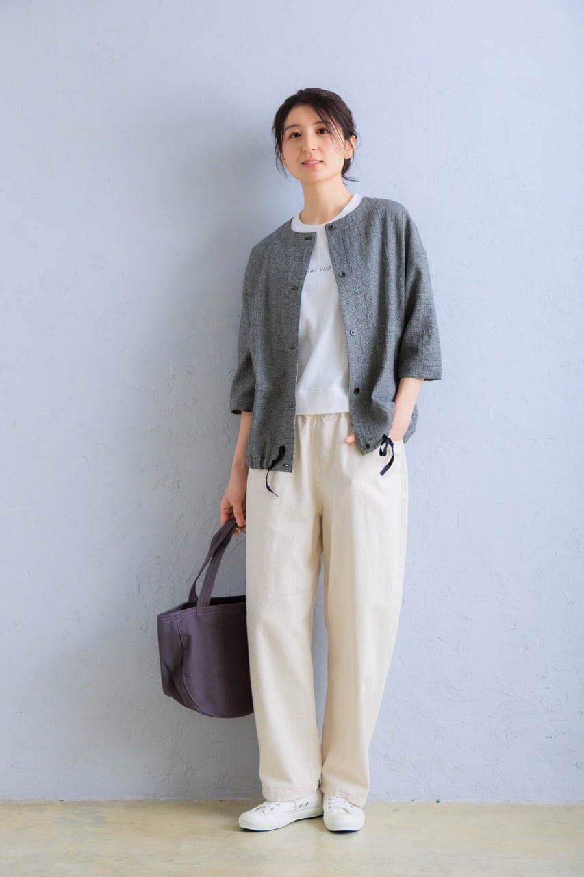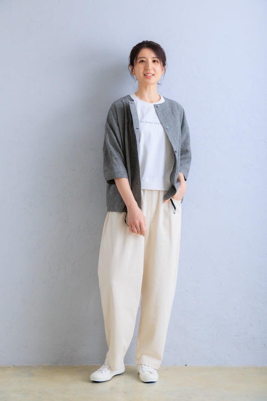 体のラインを拾いにくいほどよいシルエットで、リラックスしながらもきれいに見える大人のバランス。